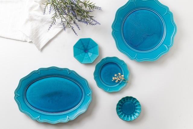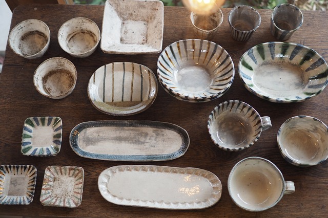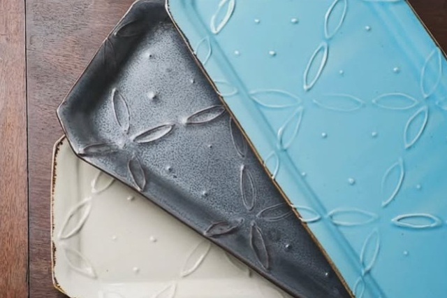 見て楽しく使ってホッとする器をお届け。様々な石膏型でつくったプレートや、イッチン技法、縞などで装飾したレトロな雰囲気の器が並びます。アイボリー、ライトブルー、ブラックの3色展開です。