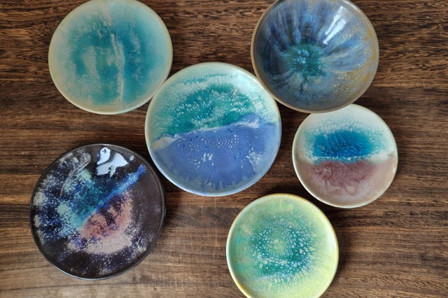 「エソラ工房」のこだわりは“色”。市販のものではなく一から調合した釉薬は唯一無二の色合いです。定番のお茶碗やお皿なども手仕事だからこそ生まれる、表情豊かな風合いをお楽しみいただけます。