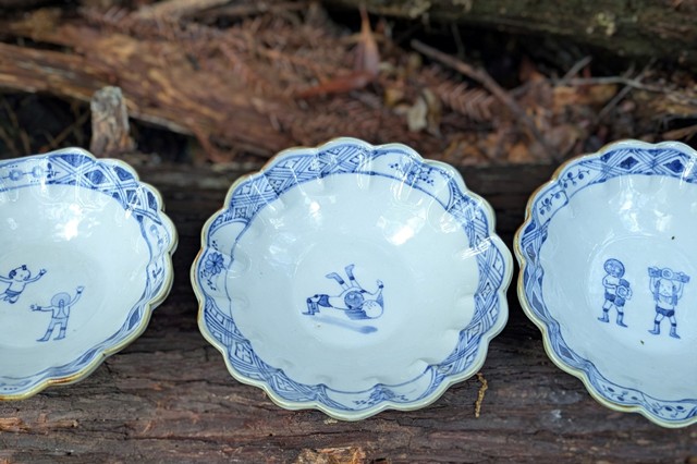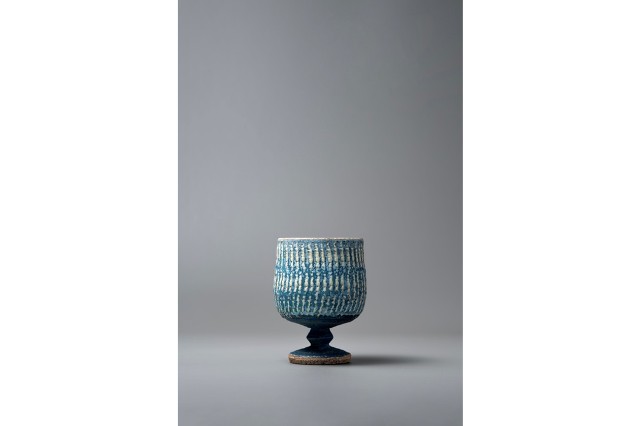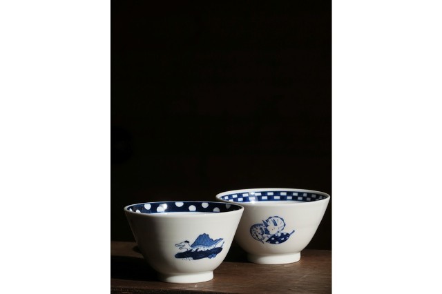 どこか懐かしさが漂う粘土から形成した染付の器をよく見ると、ちょんまげ頭やプロレスに興じる人、鹿や鳥、唐草など混沌とした風景が。器を通して生活の中に楽しみが見つかりますように。