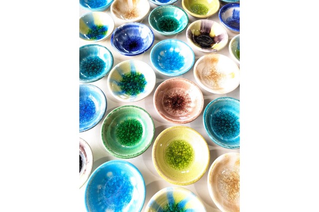 結晶釉を使用した色鮮やかでポップなデザインの器や一点もののマグカップを製作。忙しい現代の生活の中でも食事のとき、一服のときは楽しく和んだ気分になれるように。そんな想いが込められています。