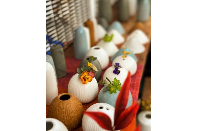 陶器の一輪挿しを30種類ほどつくっています。手のひらサイズから食卓や玄関にも映えるサイズまで、様々な色や形、大きさの花瓶をお持ちします。お庭で摘んだ小さなお花をぜひ飾って楽しんでください。