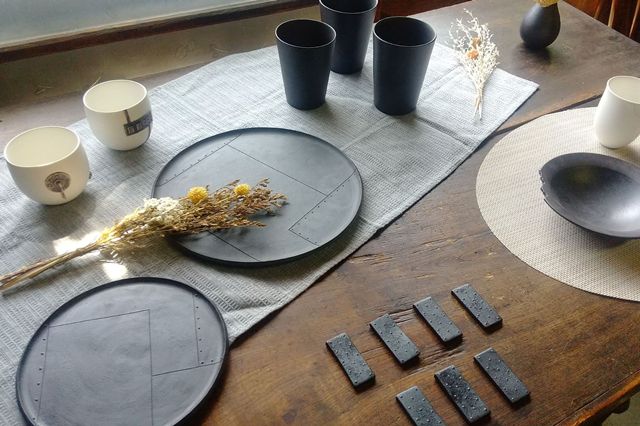 現代の暮らしに寄り添う日常使いの器を京都府綾部市にて家族で製作。和食でも洋食でも使用できる落ち着いた色合いの器や、本物の家と同じ素材を使用した、家をモチーフにしたカップやポットが並びます。
