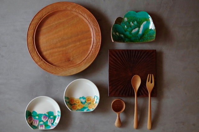 九谷焼の磁器土を使用し、呉須の濃淡や銀彩、赤絵を施した日常食器を製作している「十二月窯」と“物語のカケラ”をテーマに個性たっぷりの可愛らしい置物を製作している「岡本智晶」のコラボ出店。