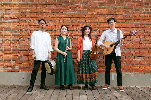 フィドル(バイオリン)、フルート&ティンホイッスル、ブズーキ、バウロンの4人編成。アイルランド伝統音楽を中心に、オリジナル曲も交えた多彩な演奏をどうぞお楽しみください。