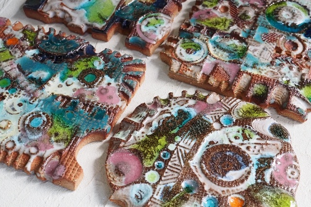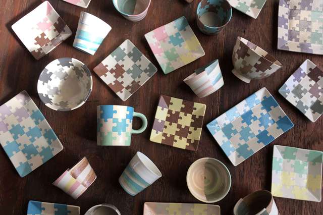 神奈川県藤沢市にて作陶している「アトリエ土窯日和」。ジグソーパズルのようにピース一つ一つを組み繋げて作成している“ピースシリーズ”を中心に、色や質感の異なる土を組み合わせた器が並びます。