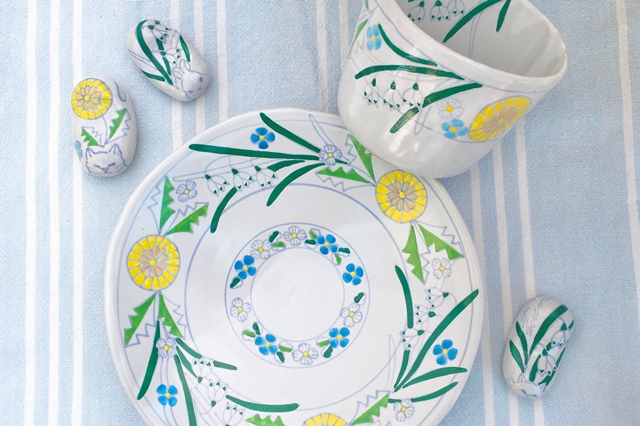 絵付けにこだわった食器を製作。季節の草花や猫など、自身が心惹かれるモチーフを図案にしています。今回はミモザやタンポポなど、春を感じられるような絵柄の食器をお届け。暮らしが華やぐ一皿をどうぞ。
