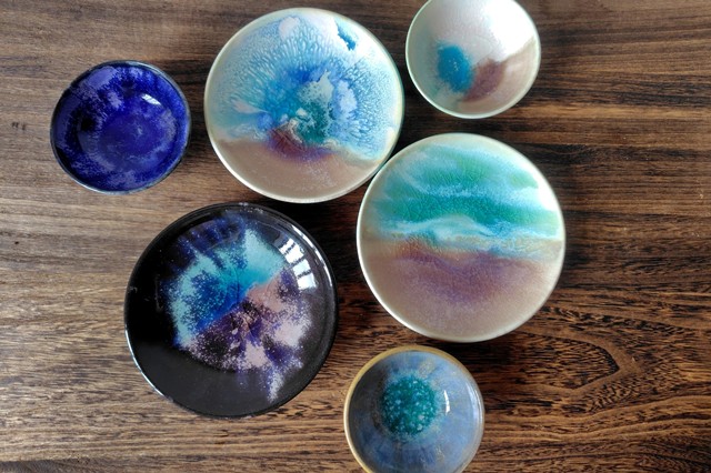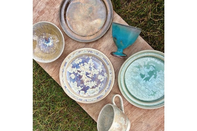 結晶釉を使用した色鮮やかでポップなデザインの器や一点もののマグカップを製作。忙しい現代の生活の中でも食事のとき、一服のときは楽しく和んだ気分になれるように。そんな想いが込められています。