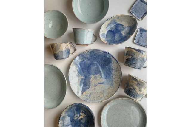 伊賀の土とオリジナル釉薬で、普段使いの食器や花器を製作。白、オリーブ、スカイブルー、ネイビーブルーの四色で仕上げたマグカップをはじめ 、手仕事ならではの温もりとゆらぎのある作品が並びます。