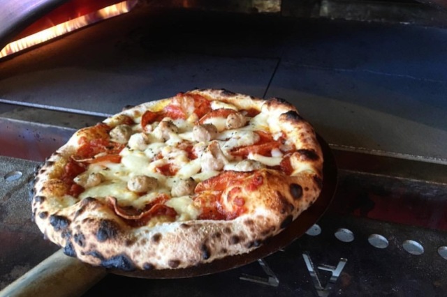 石窯を積んだフードトラック「RUBBER TRAMP」。独自配合をしている3種のブレンドチーズは、コクと旨味が絶妙なバランスです。生地やソースはすべて手づくりで、一枚一枚丁寧に焼き上げます。